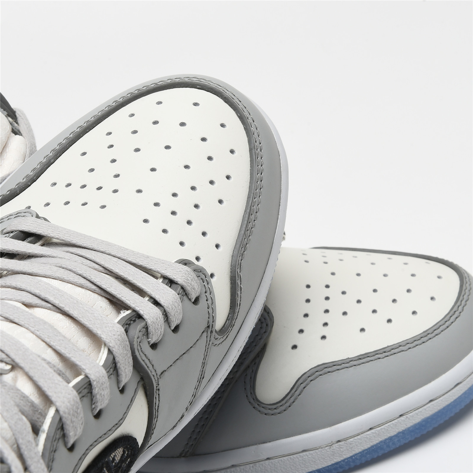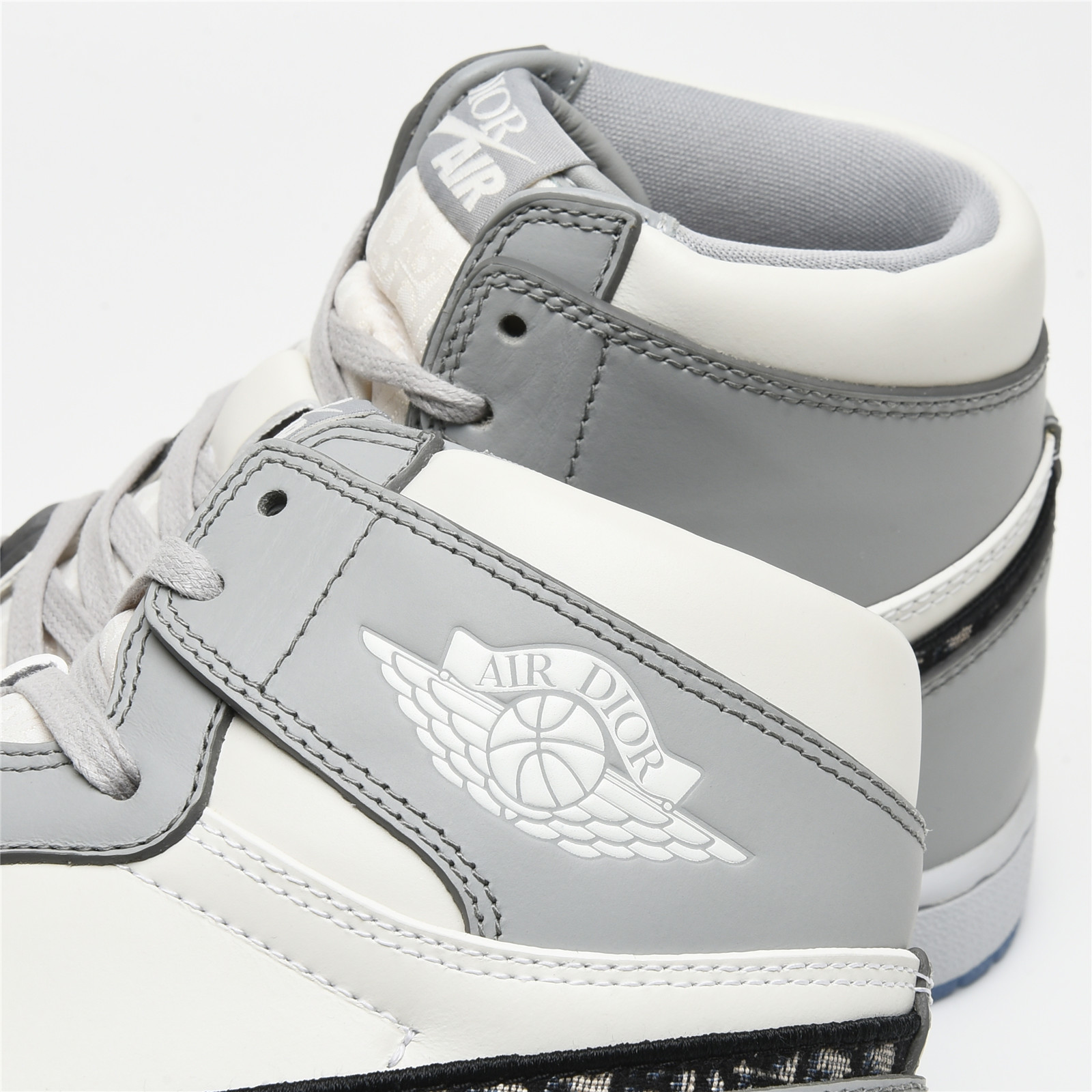 This Jordan 1 Retro High is composed of a white and grey leather upper with traditional Dior monogram print Swoosh. These shoes are made in Italy with premium materials. Co-branded icy translucent soles, Dior branded tongue and Wings logo, and a silver "Air Dior" hang tag completes the design.