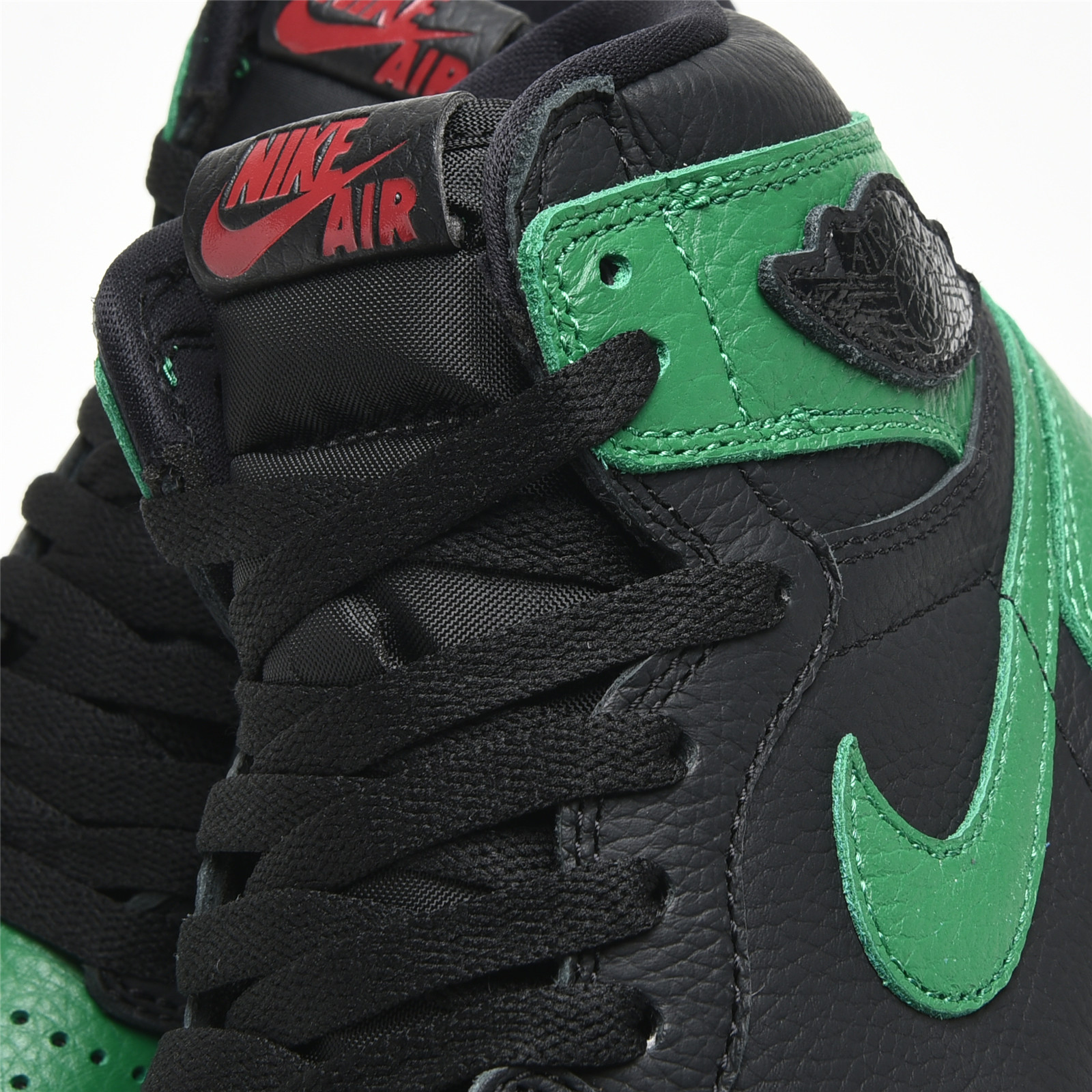 This Jordan 1 High is comprised of a black tumbled leather upper with green leather overlays. A Gym Red embroidered tongue tag, sail midsole, and pine green outsole completes this design.