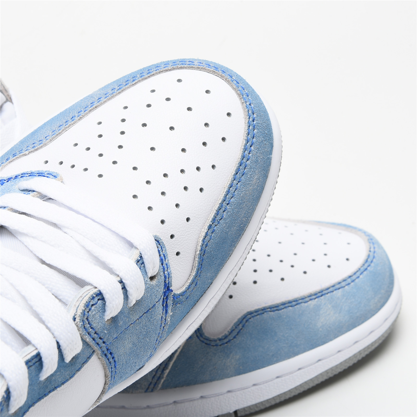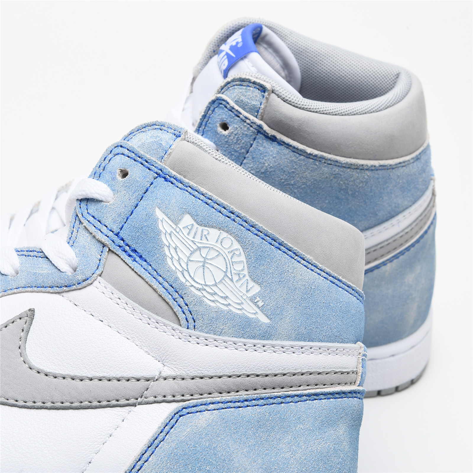 The upper of the AIR JtggORDAN 1 Hyper Royal is constructed with white leather and distressed Hyper Royal suede overlays while the Swoosh and panels around the ankle are made with a Light Smoke Grey Durabuck. Consistent with Jordan 1s of the past, a classic white "Wings" logo appears on the lateral ankle. A blue woven Nittgke Air label stitched on the tongue, a white midsole, and a Light Smoke Grey outsole add the finishing touches to this retro design.