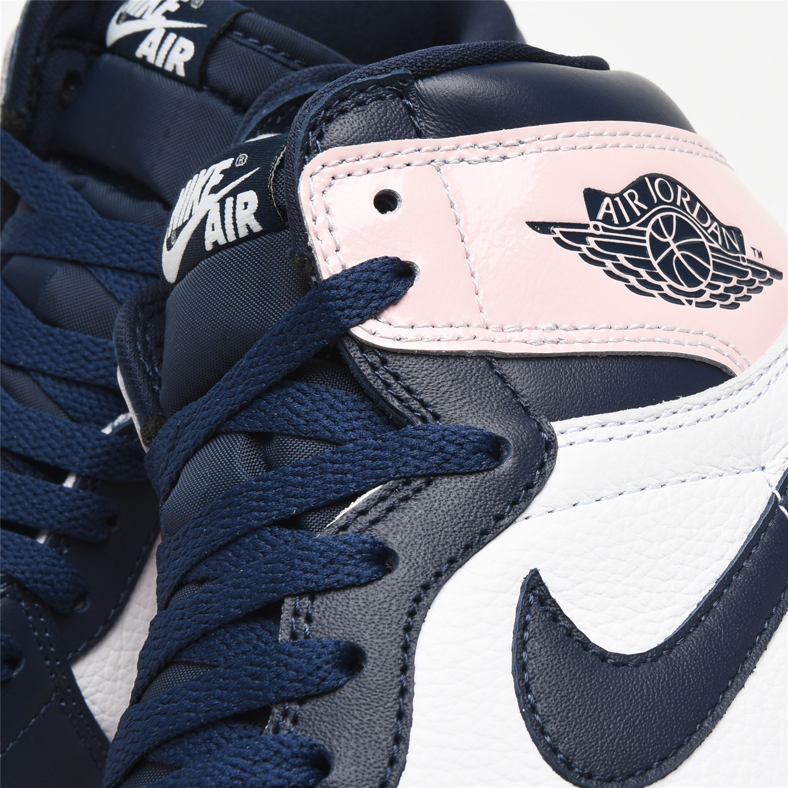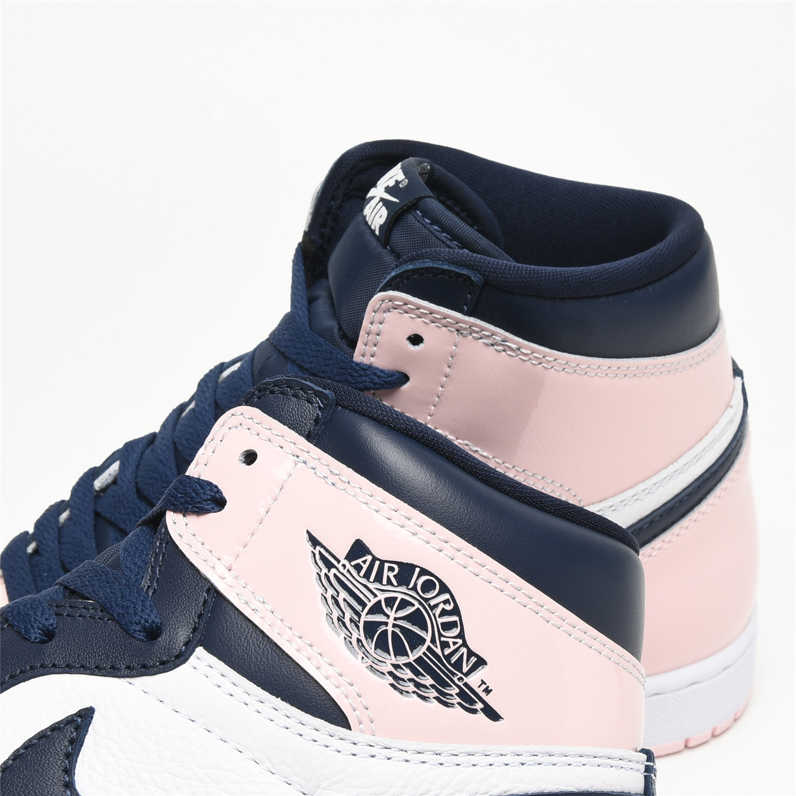 AIR JtggORDAN 1 High Atmosphere follows the classic Black Toe color blocking format with a white and dark navy leather upper. Light pink patent leather on the ankle and vamp nods to the pink bubblegum that Michael Jordan chewed throughout his time on the hardwood. Woven Nittgke tongue labels and a signature Jordan Wings logo draw inspiration from the original 1985 Jordan 1 design.